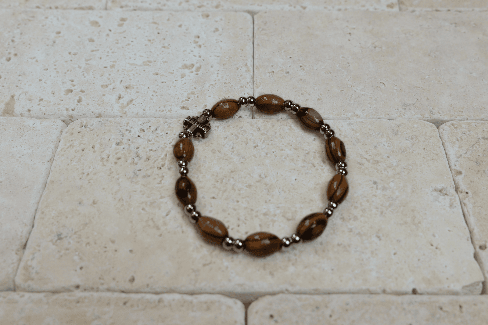 Bransoletka z drzewa oliwnego z nawleczonym Krzyżem Jerozolimskim (owalne kulki)
