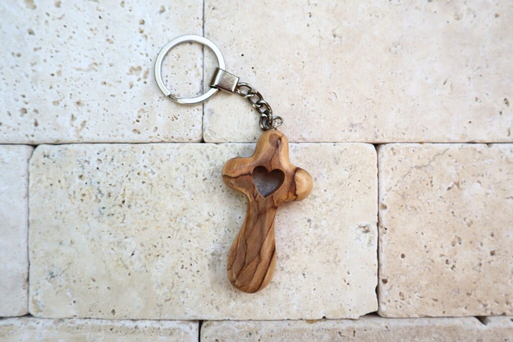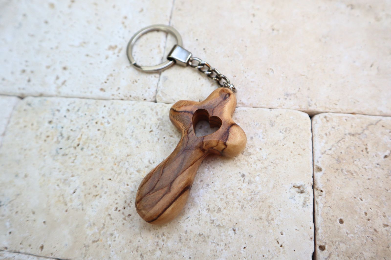 Krzyż breloka został wykonany z drzewa oliwnego przez lokalnych rękodzielników z Ziemi Świętej. Na krzyżu znajduje się grawer serca.