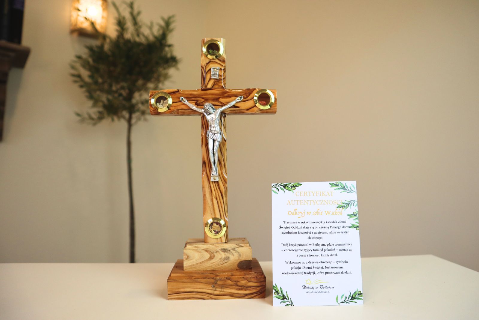 Krzyż został starannie wykonany z drzewa oliwnego przez lokalnych rękodzielników z Betlejem – rdzennych chrześcijan Ziemi Świętej.