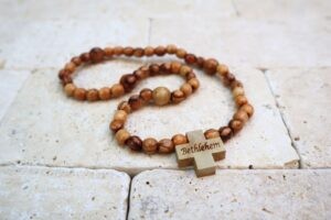 Różaniec został wykonany przez lokalnych chrześcijan w Betlejem. Paciorki oraz krzyżyk są z drzewa oliwnego, które rosło w Ziemi Świętej przez kilkaset lat. Różaniec jest na gumce i możesz go nosić na ręce jak bransoletkę.